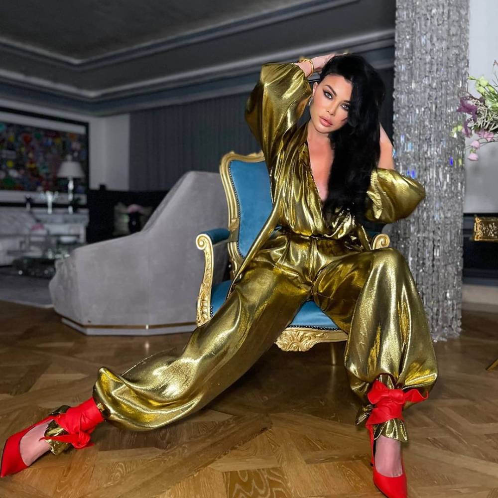 ستنال إعجابك إطلالة مايا الدياب، بهذه الجمبوست السوداء من المخمل، مع أكتاف عريضة وأكمام طويلة، كما أنها مزوقة بالكريستال اللامع.