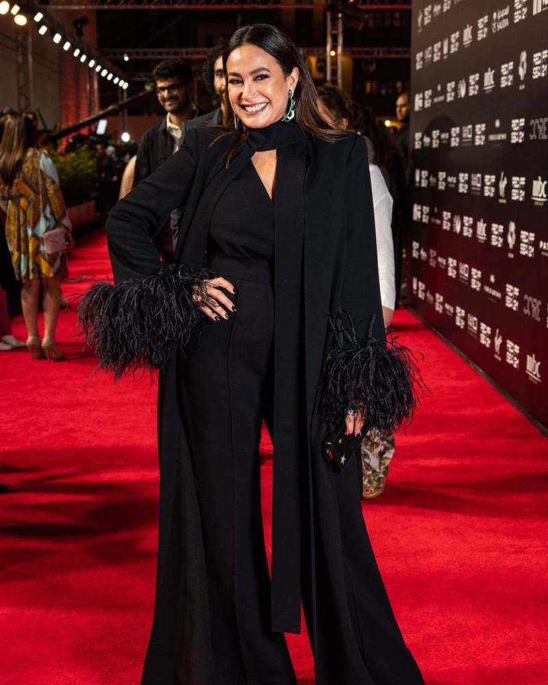 للتمتع بلوك كلاسيكي أنيق، يمكنك أن تستوحي إطلالتك من النجمة هند صبري، حيث ظهرت بجمبوست أسود مع توب بأكمام طويلة مزوقة بالريش، تستطعين تنسيقها مع حذاء ذو كعب عالي أسود وحقيبة كلاتش صغيرة.