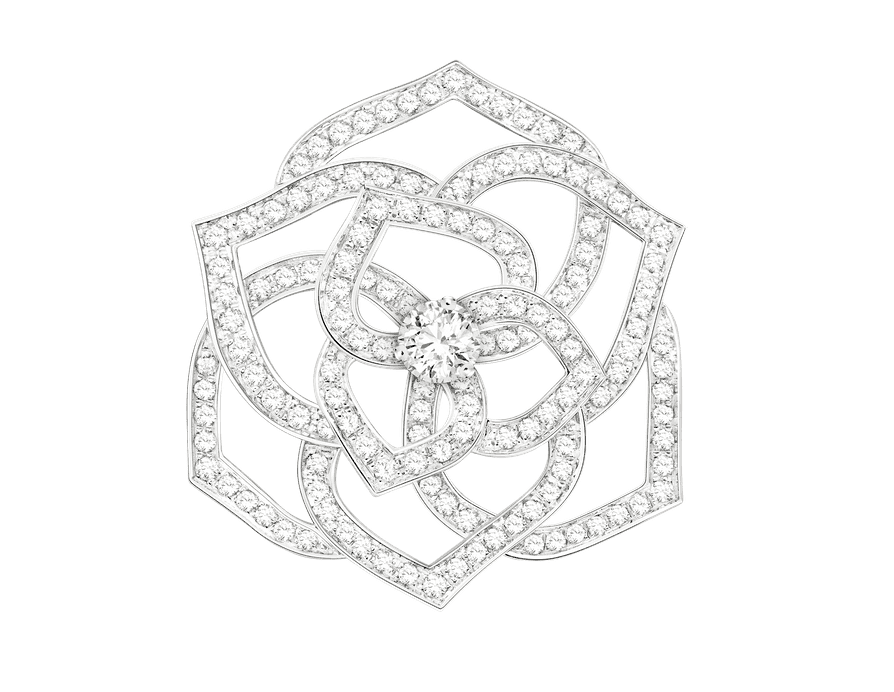 بروش من الذهب الأبيض مزين بأحجار الألماس بطريقة غاية في النظام والدقة على شكل وردة تتكون من القلوب الجذابة وفي وسط البروش نجد قطعة ألماس أكبر حجما من غيرها في التصميم، ويناسب البروش مختلف الإطلالات خاصة المناسبات والحفلات في فصل الشتاء لأن شكل الزهرة جذاب ويأسر القلوب.