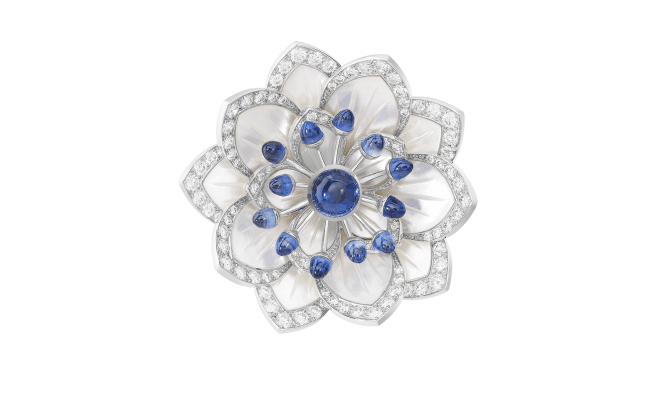 دار بوشرون للمجوهرات أصدرت أيضا بروش على شكل زهرة ولكن صنع من الذهب الأبيض ومرصع بأحجار اللؤلؤ والياقوت الأزرق والألماس الأبيض بتصميم فاخر يجمع بين أفضل الألوان والأحجار الكريمة على الإطلاق.