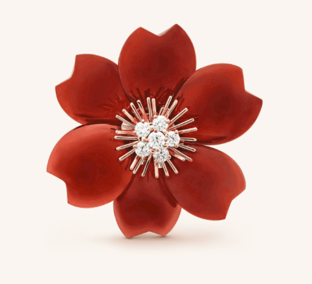 تصميم بروش على شكل وردة كبيرة من شركة فان كليف اند اربلز تحتوي على الذهب الوردي وأحجار الألماس والكارنيليان المميز، وقد اجتمعت المكونات لتكون بروش بتصميم غاية في الروعة والجمال بلونه الأحمر الجذاب الذي يناسب سهرات رأس السنة.