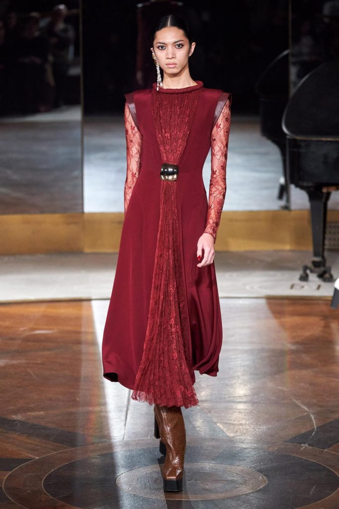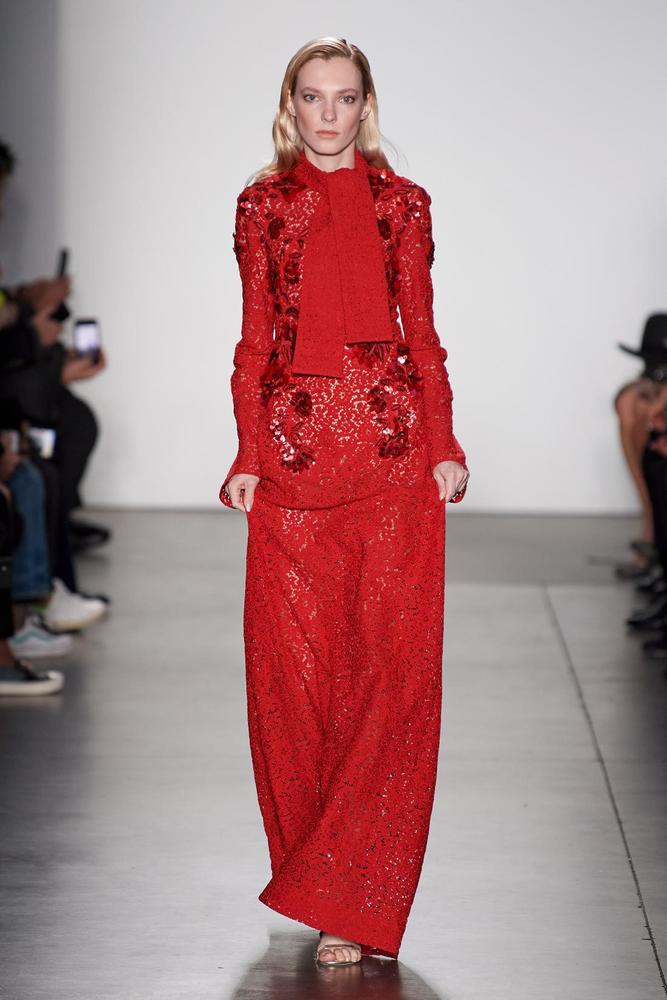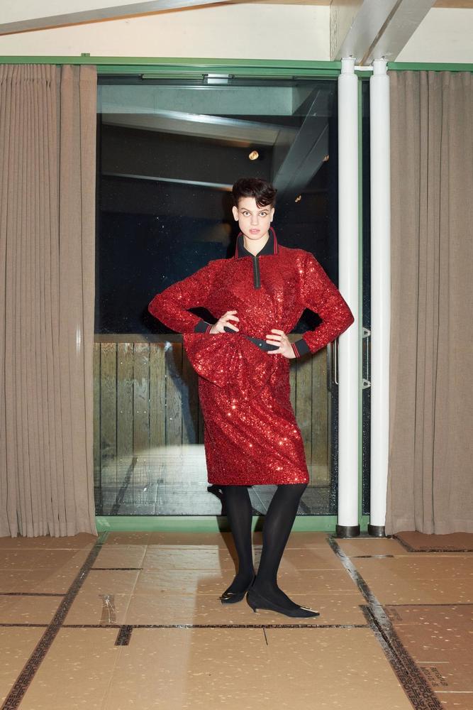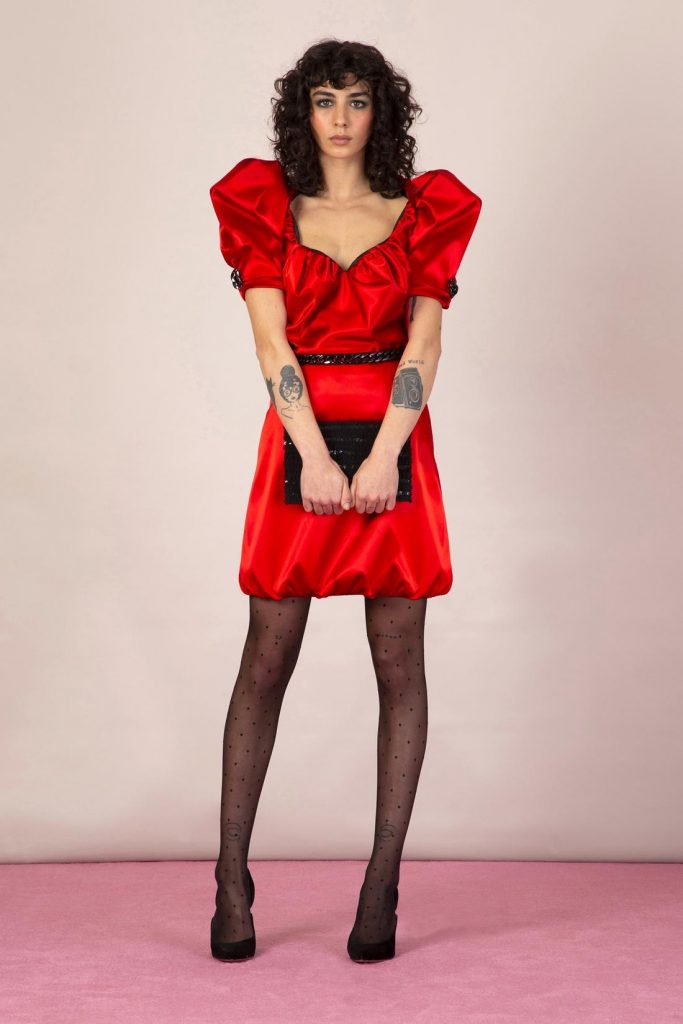 اخترنا لك كذلك هذا الفستان الأحمر من ماركة Emilio de la Morena المزوق بقبة على شكل Heart Neck وأكمام منفوخة، يمكنك تنسيقه مع حذاء أسود مدبب وذو كعب عالي.