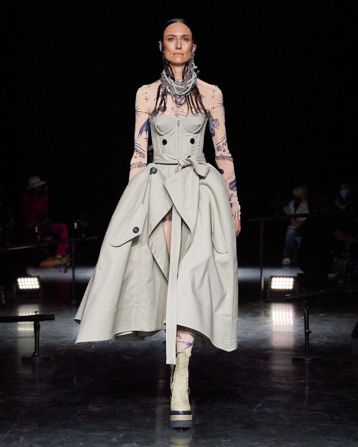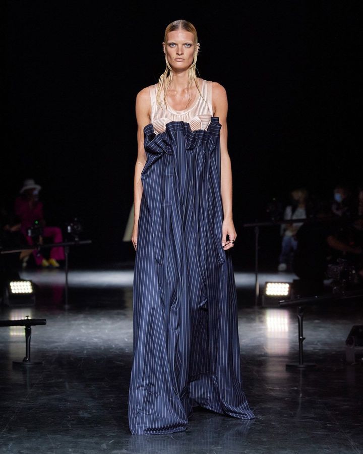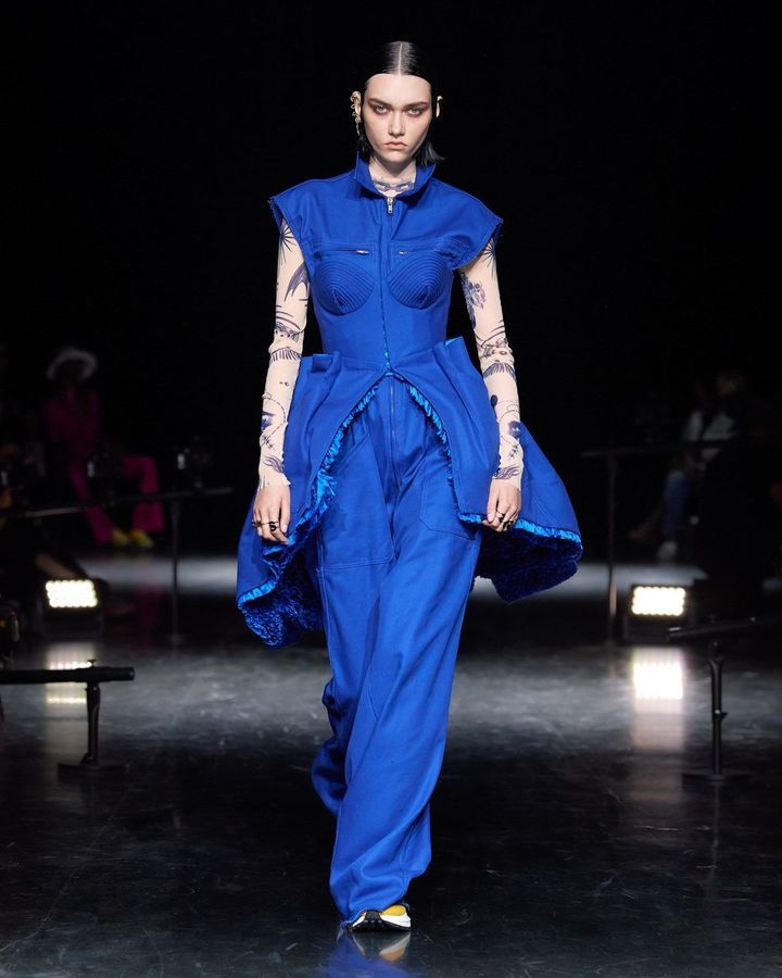 ومن المستحيل أن نتجاهل بلوزة البحارة الزرقاء والبيضاء الشهيرة من Gaultier ، والتي قام بتنسيقها مع التنورة المتعددة الألوان من Sacaï. ناهيك عن المعاطف المصنوعة من الفرو الصناعي والكبيرة الحجم. شاهدي معنا هذه التشكيلة المميزة والمختلفة.