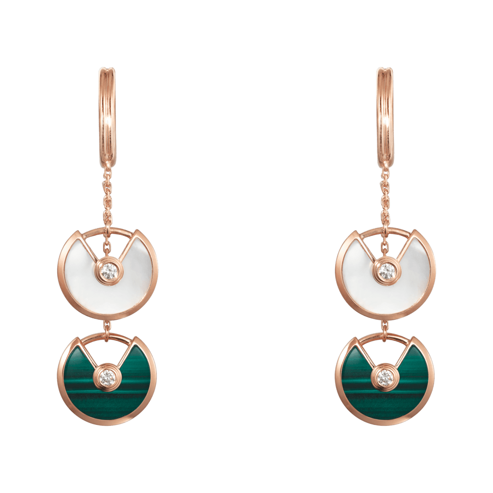 نقدم لك هذه الأقراط المتدلية من علامة كارتييه الفرنسية Cartier المصنوعة من الذهب الوردي الذي يزينه عرق اللؤلؤ مع حجر الملاكيت المميز بتموجات لونه الأخضر الجميلة، في تصميم جذاب بأسلوب عصري.