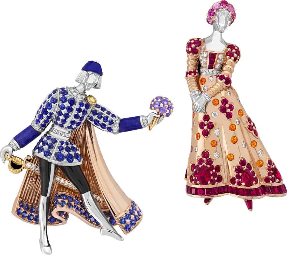 نقدم لك هذا البروش الغاية في الرومانسية من مجموعة Romeo & Juliet المصنوع من الذهب الأبيض والوردي مع كل من حجر الغارنيت والياقوت باللون الأزرق والأحمر والألماس باللون الأبيض والأصفر واللازورد.