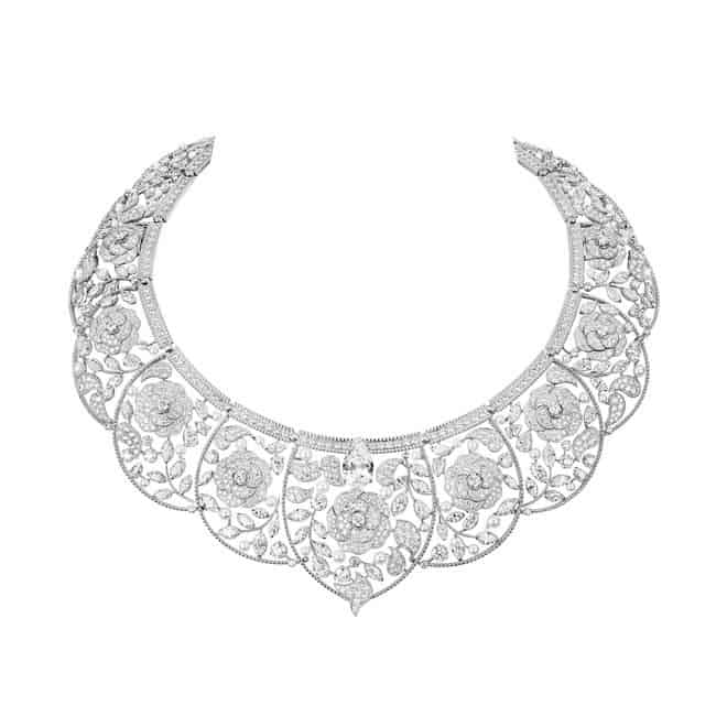 في تصميم مستلهم من ياقات الدانتيل المزينة قدمت لنا علامة شانيل و ضمن مجموعتها Le Paris Russe De Chanel هذه السلسلة البراقة بالذهب الأبيض المرصع بالألماس في زينة بشكل زهور الكاميليا، وليس غريبا على شنال مثل هذه التصاميم الفخمة والتي تتميز ببعدها الطبيعي.