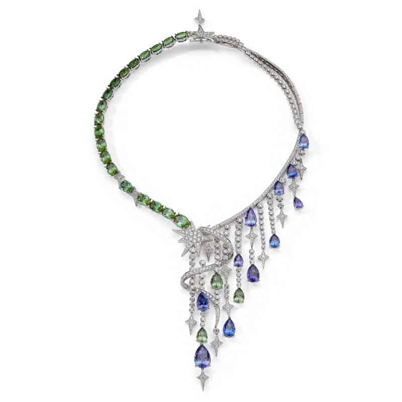من مجموعة العلامة بودلز البريطانية لصناعة المجوهرات « Wonderland 2019 » نقدم لك هذه السلسلة الأنيقة بالذهب الأبيض والتورمالين باللون الأخضر والتنزانيت والألماس في تصميم منعش وعذب.