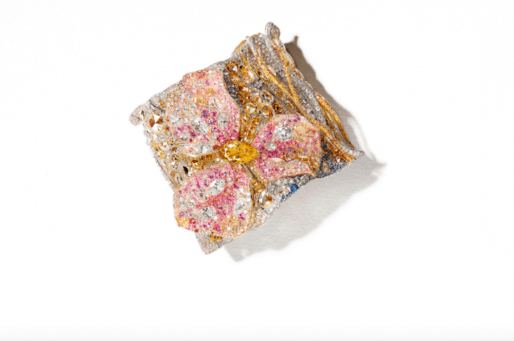 نقدم لك هذا السوار الفخم من الماركة التايوانية سيندي تشاو والمصنوع من الذهب الأبيض المرصع بعدة أنواع من الأحجار الكريمة الملونة كالياقوت الأصفر، الأزرق والوردي والألماس الملون والأبيض، في زينة بشكل زهور.