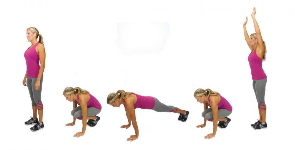 قفي بشكل مستقيم ومن ثم خذي وضعية القرفصاء بثني الركبتين مع وضع اليدين على الأرض، قومي بركل رجليك في اتجاه الخلف لكي يصبح وزن جسمك على يديك وتصبحين بذلك في وضعية حركة البلانك Plank، قومي عندها ببعض حركات تمرين الـPush Up، من ثم وباستعمال أصابع قدميك ادفعي جسمك من الأرض لتقفي مجددا.