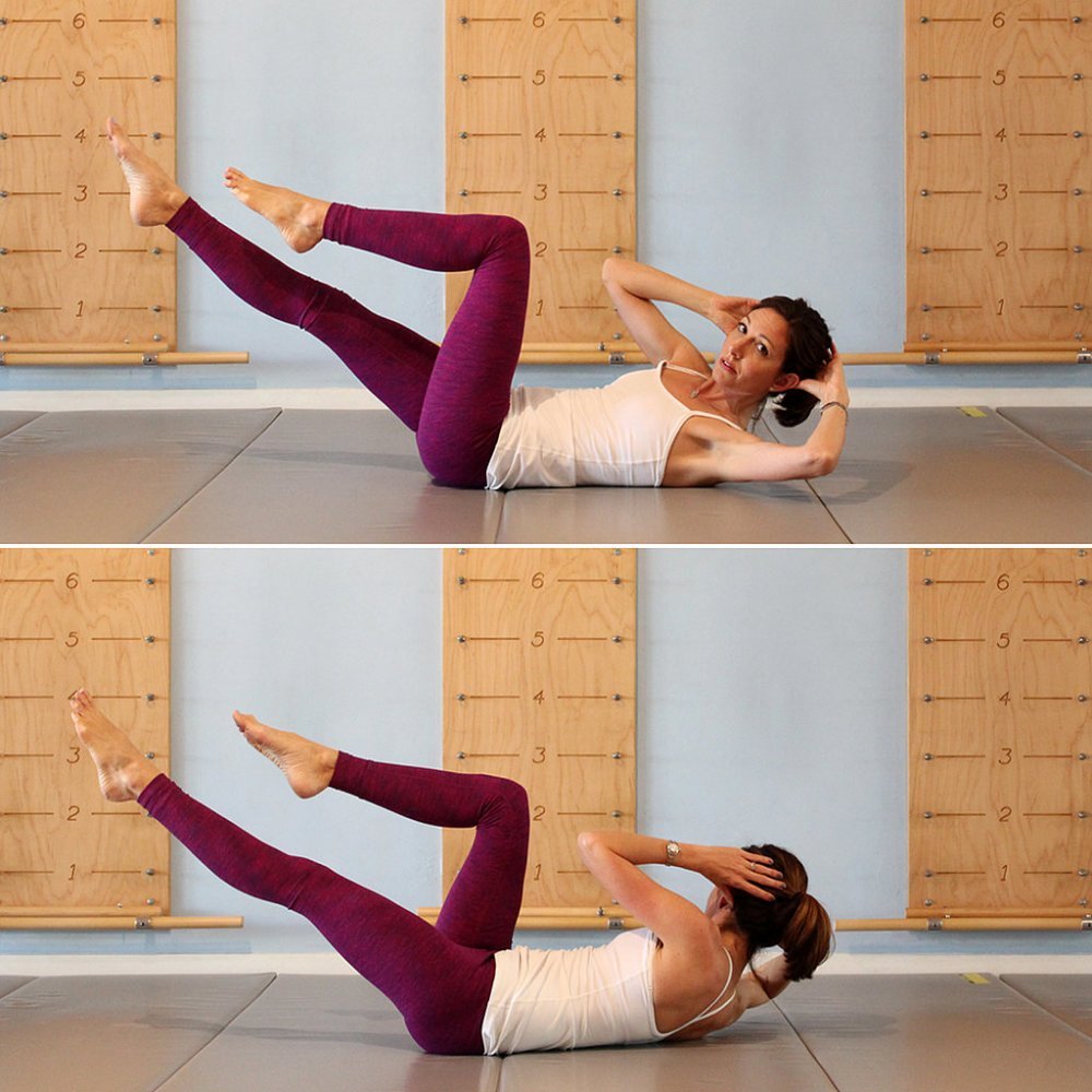 قومي بالاستلقاء أرضا على ظهرك، مع وضع اليدين خلف الرأس والحرص على رفع الكتفين عن الأرض، من ثم قومي برفع ركبتيك إلى الأعلى مثنيتين والحرص على ترك الساق في شكل مواز للأرض، بعدها قومي بحركة تبادلية تماما مثل قيادة الدراجة.