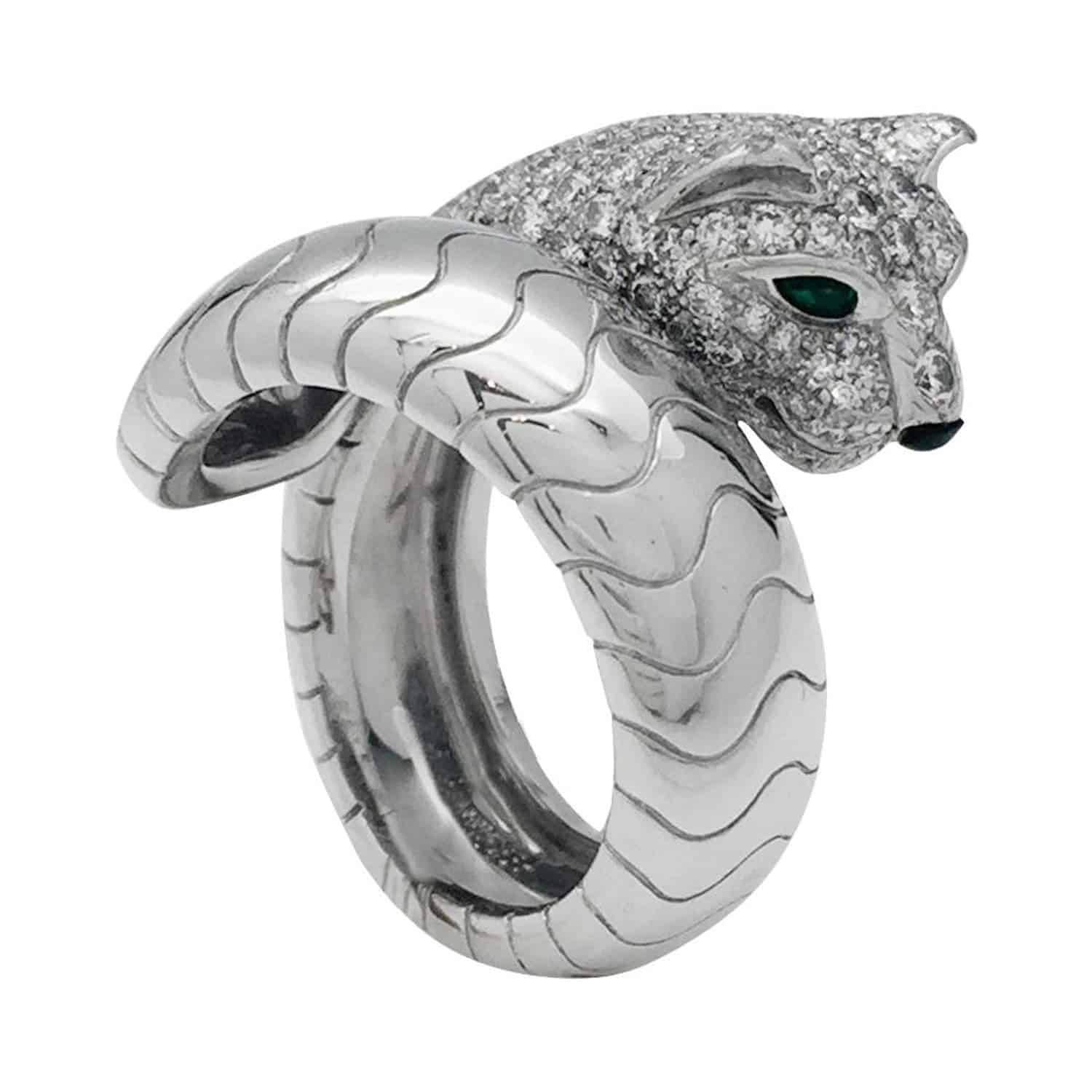 مصمم من الذهب الأبيض عيار 18 قيراط مرصع بــ 308 حبة من الماس إلى جانب الزمرد والعقيق، تصميم على شكل فهد مع ترصيع عينيه وأنفه بالمجوهرات، البعد الطبيعي لتصميمه زاده جمالا وجعله تحفة في يديك، ينصح بارتدائه في السهرات.