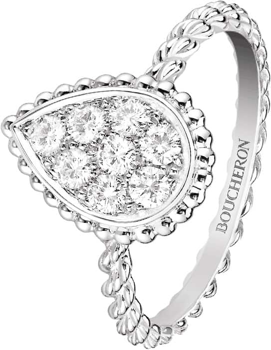 تصميم بوشرون لهذا الخاتم المصنوع من الذهب الأبيض عيار 18 قيراط، مرصع بالماس على شكل فني مبهر من خلال استخدام حبات الماس مستدير الشكل، يتميز أيضا بشكل الأساس المستلهم من الحيل بطريقة فنية ونقوش دقيقة تلفت الانتباه، طريقة ورقة تصميمه تجعله خاتمك المفضل كل نهار لأن مظهره الجذاب وشكله الانسيابي لن يسمح لقلبك بتركه.