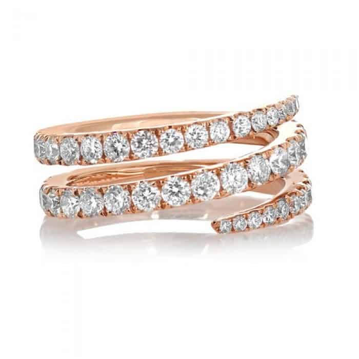 مصنوع من الذهب الوردي عيار 18 قيراط ،تصميم أنثوي بامتياز وناعم على أصابعك، مرصع بحبات الماس، طريقة استدارة الأساس مع مواصلة الترصيع لنهاية التصميم يجعله من أفخر الخواتم التي تشاهدينها في حياتك، مناسب للسهرات ولكن شرط أن تضع هذا الخاتم وحده ليظهر على أحسن وجه في يديك.