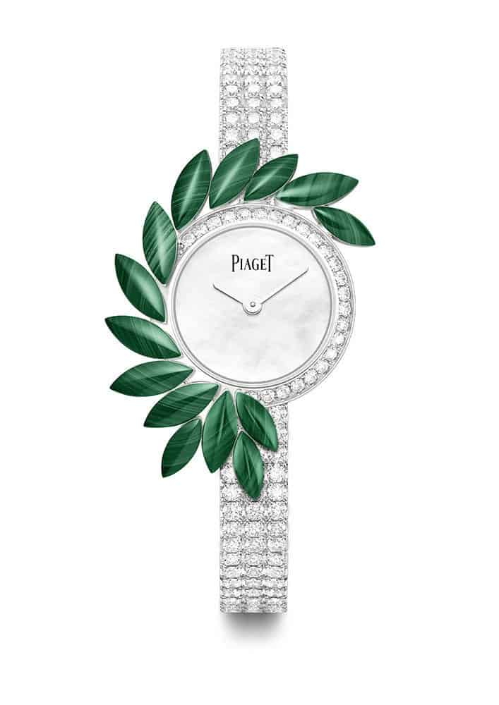 من علامة بياجيه انتقينا لك منها ساعة Vegetal Lace الفخمة التي صنعت من الذهب الأبيض والمغطية بالألماس البراق مع قطع من أحجار الملاكيت في شكل أوراق، في تصميم مشرق وأنيق.