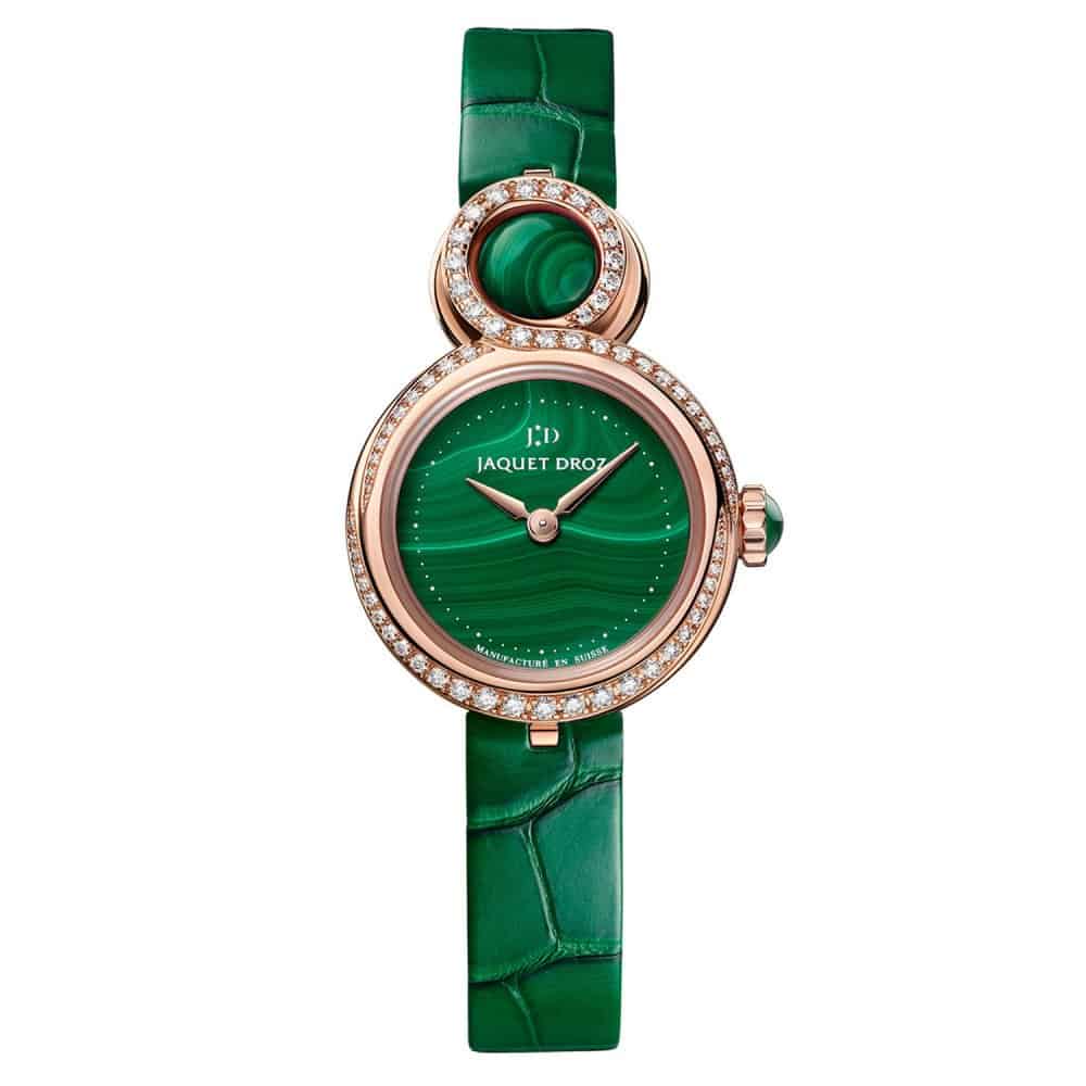 من العلامة السويسرية جاكيه دروز اخترنا لك ساعة Droz Lady 8 Petite المصنوعة من الذهب الوردي المتألق والذي زين بالألماس اللامع مع الملاكيت بشكله الأنيق، في تصميم أنثوي ناعم بأسلوب رشيق.