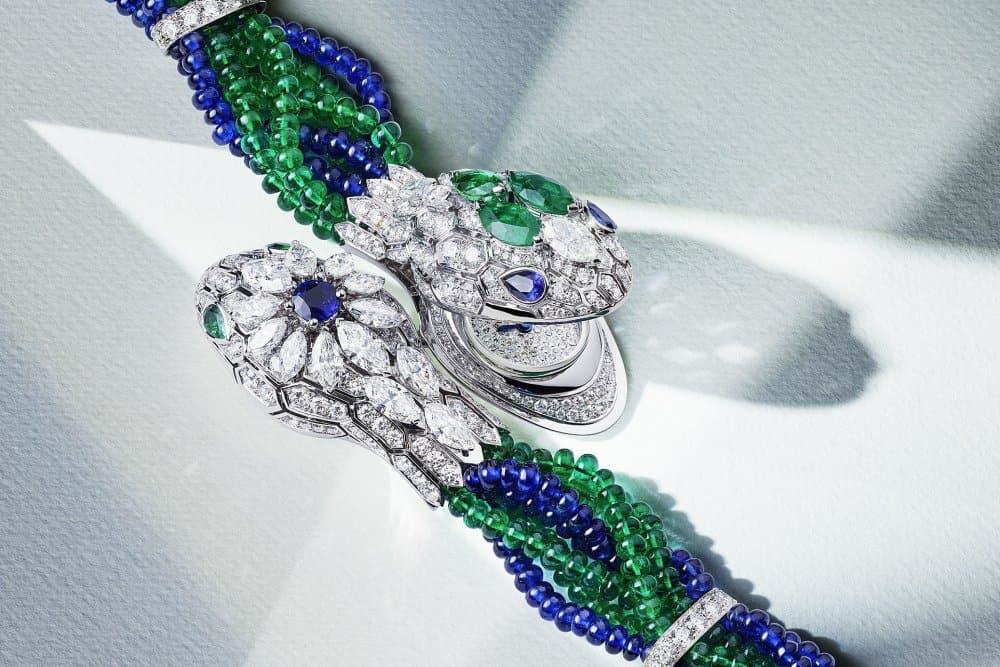 من علامة بولغاري الإيطالية للمجوهرات اخترنا لك Serpenti Misteriosi Intrecciato الساعة الفريدة والرائعة والتي صنعت من الذهب الأبيض المزين بعدة أنواع من الأحجار الكريمة وهي الألماس والزمرد الأخضر والياقوت الأزرق، في تصميم خلاب وجميل في شكل أفعى سيربانتي.