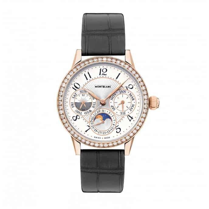 ومن مون بلان اقتنينا لك هذه الساعة ذات المينا الذي يحتوي على تقويم قمري يومي وسنوي، والتي تستمد تألقها من الذهب الوردي الذي صنعت منه حيث زين بالألماس بتصميم لافت جميل.