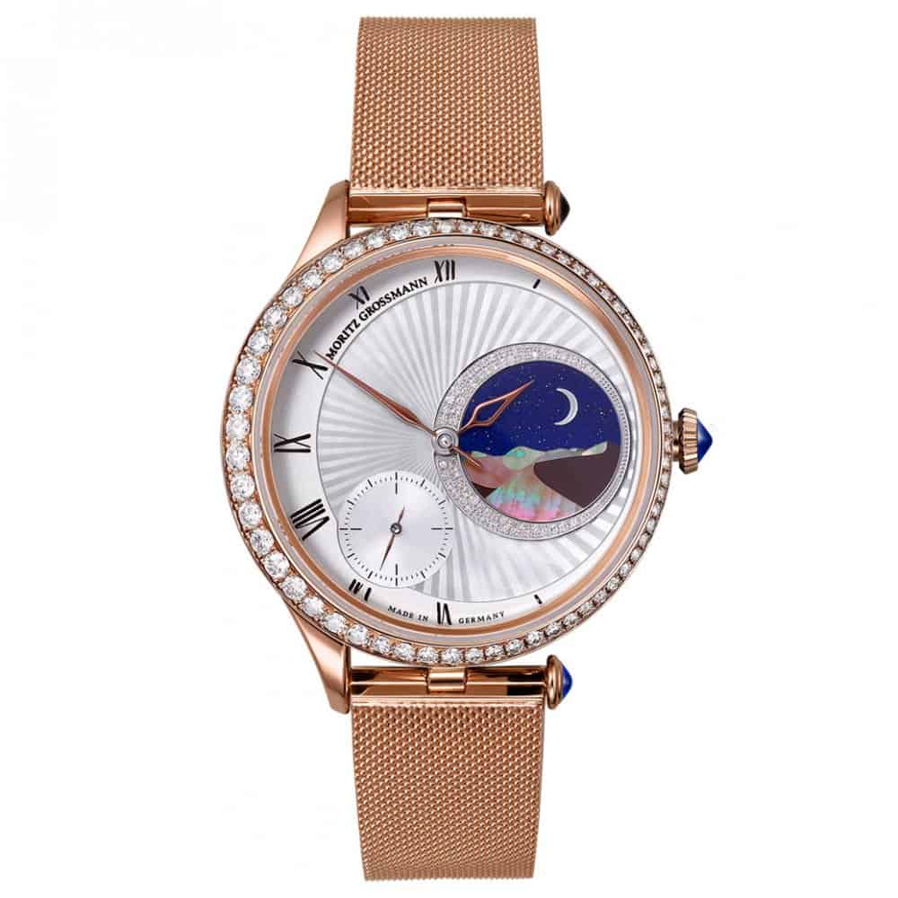 نبدأ هذه القائمة بساعة العلامة الألمانية موريتز غروسمان والمصنوعة من الذهب الوردي الذي تم تزيينه بالألماس، عرق اللؤلؤ والأفنتورين بتصميم ذو لمسة شرقية برسمة تمثل ليالي الصحراء على الميناء.