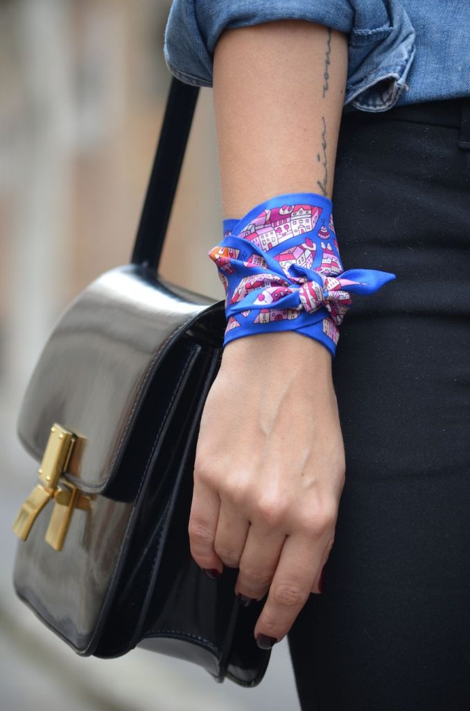 فكرة أنيقة أخرى، ننصحك بتجربتها، حيث عليك لف البندانا حول مقود الحقيبة، سيمنحك إطلالة جذابة ومميزة خاصة إذا كان موديل الحقيبة بسيط.