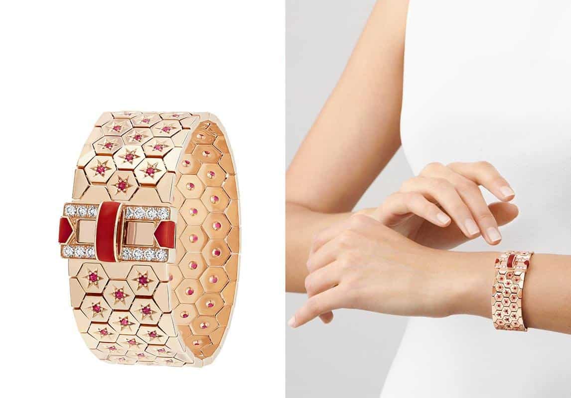 هذا السوار الذهبي زين بشكل غاية في الروعة بالألماس البراق والمرجان الذي يطغى على تصميمه، وتلفت الأنظار قطع الياقوت ذات اللون الأحمر الجميل التي رصع بها بشكل نجوم.