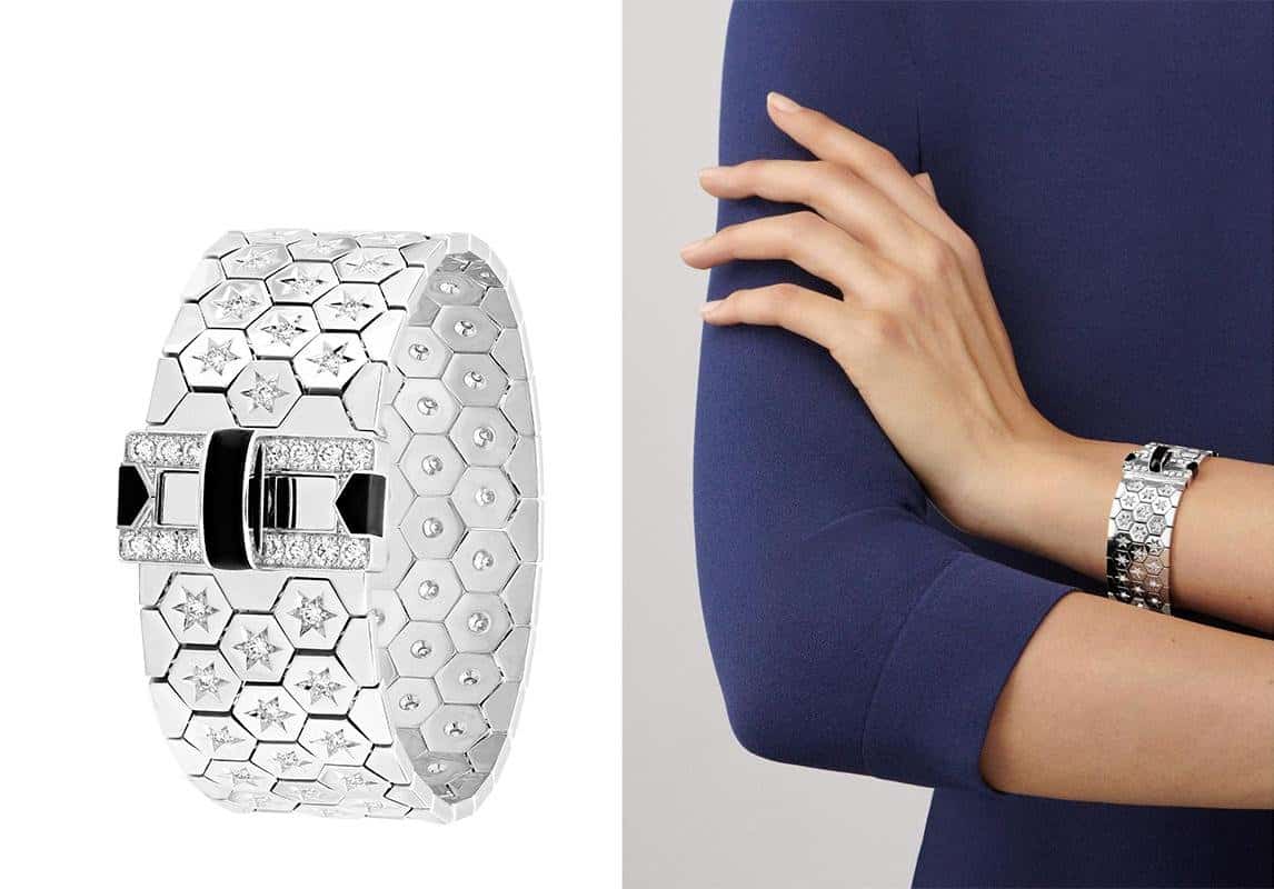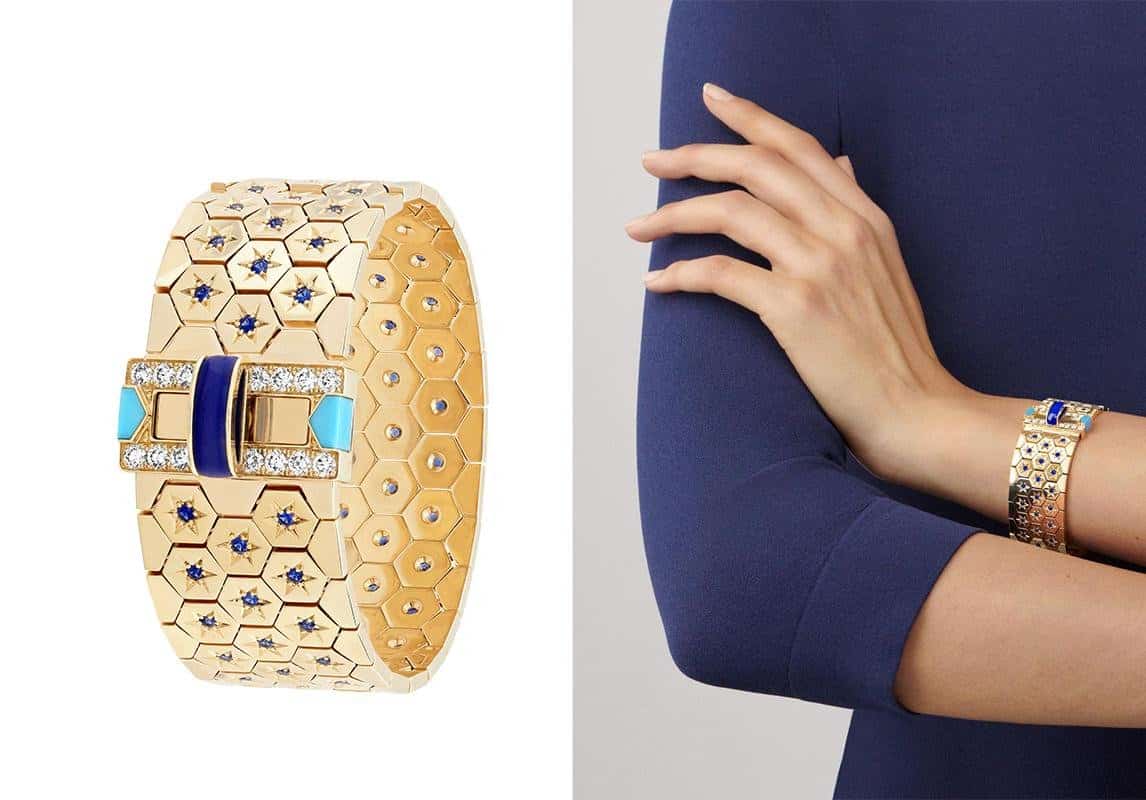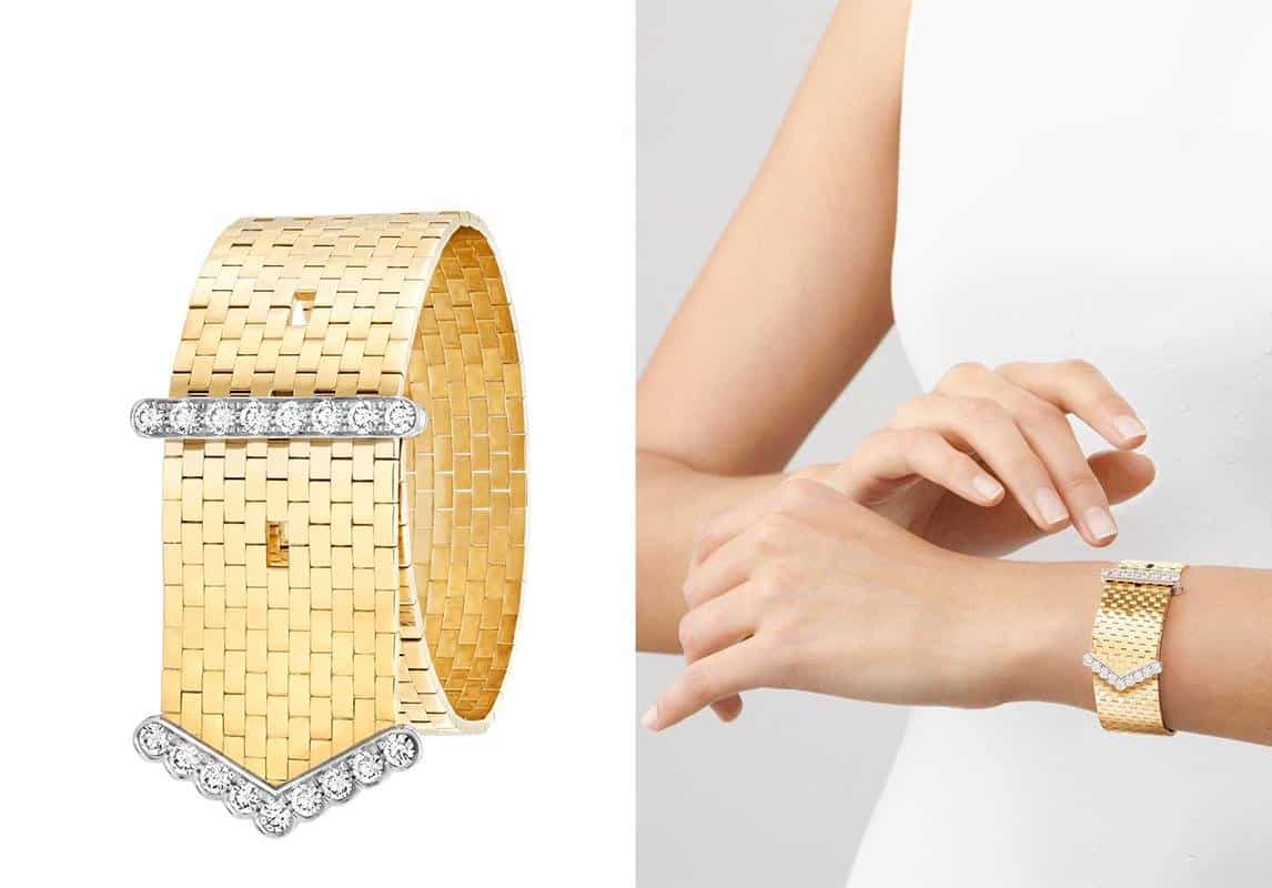 نقدم لك الإصدار أو الموديل الأول، صنع هذا السوار في أغلبيته من الذهب الأصفر مع القليل من القطع من الذهب الأبيض والذي تم تزيينه بقطع من أحجار الألماس، يتميز هذا السوار بمرونته التي يعززها الشكل الذي صمم به، حيث تم تصميمه في شكل مستطيلات متشابكة صغيرة الحجم تأمن مرونة فتحه وغلقه بسهولة، وستجدين القفل الذي يأتي في شكل حلقة حزام، مع نهاية في شكل سهم من الذهب الأبيض المرصع بالألماس.