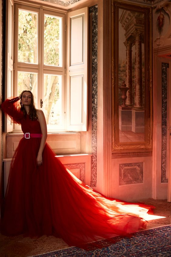 لمحبي الإطلالات الراقية والفاخرة، عليك أن تستلهمي فستانك من هذا التصميم الأنيق المطرز بالتول الأحمر على شكل ورود براقة وقطار طويل مثل الأميرات.