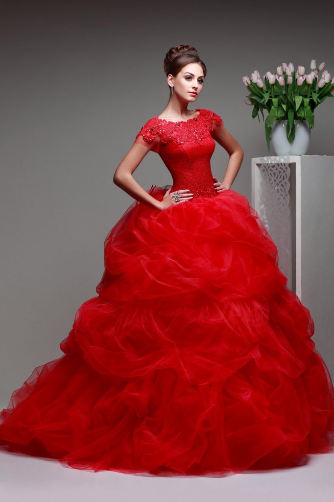 فستان زفاف أحمر جريء مزوق بطبقات من التول والكشكشة للتمتع بإطلالة مذهلة