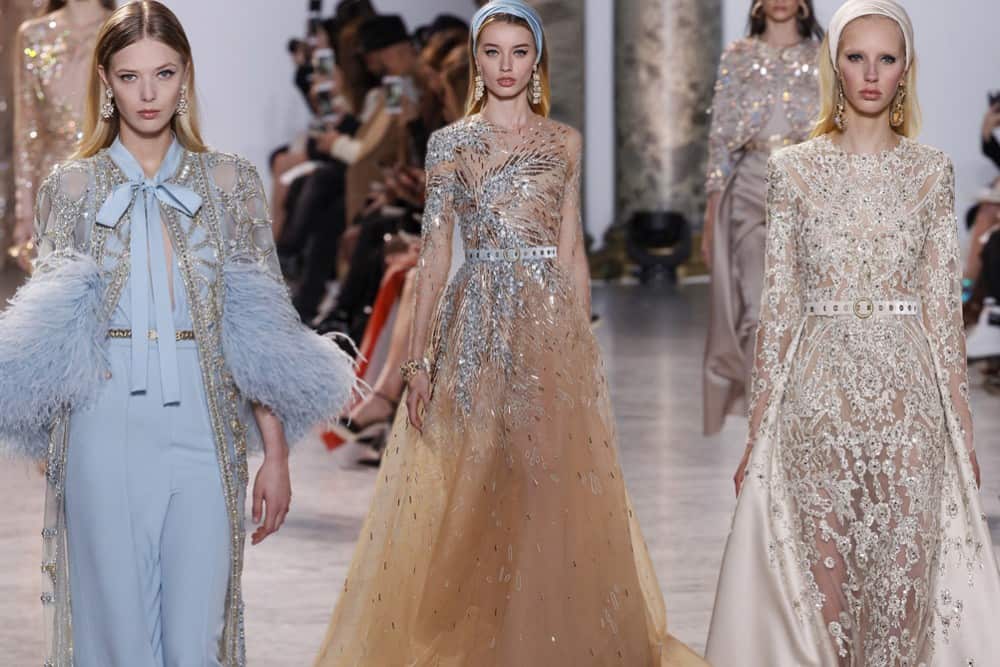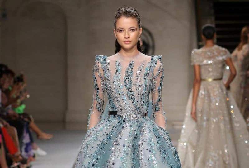 الفساتين المطرزة والشفافة كانت حاضرة في أغلب تصاميم إيلي صعب والتي تميزت أيضا بأكمامها الطويلة التي تشبه في شكلها تصاميم العبايات، يمكنك أن ترتدي معها بطانة سميكة لتكون إطلالتك محتشمة، مع حجاب أسود من الساتان المخملي لأن حزام الخصر الفيلفت باللون ذاته.