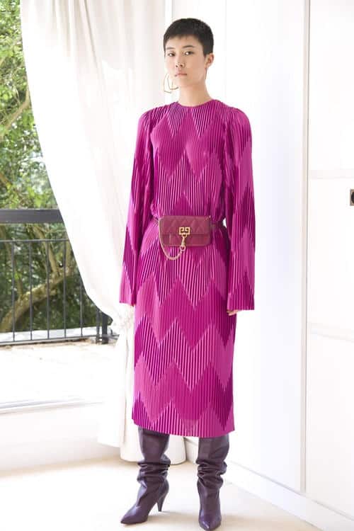 إذا كنت من عشاق الألوان الداكنة واللمسة الكلاسيكية الراقية فعليك معرفة تصاميم جوليان فورني خاصة فستانها باللون البنفسجي بقصة جميلة مع خامة الساتان الناعمة وأكمام طويلة، يمكنك تنسيق حجاب بلون غامق معه ليتناسب مع إطلالتك، كما يمكنك أن تنقصي حدة اللون من خلال حجاب باللون الأبيض أوالبيبي روز.