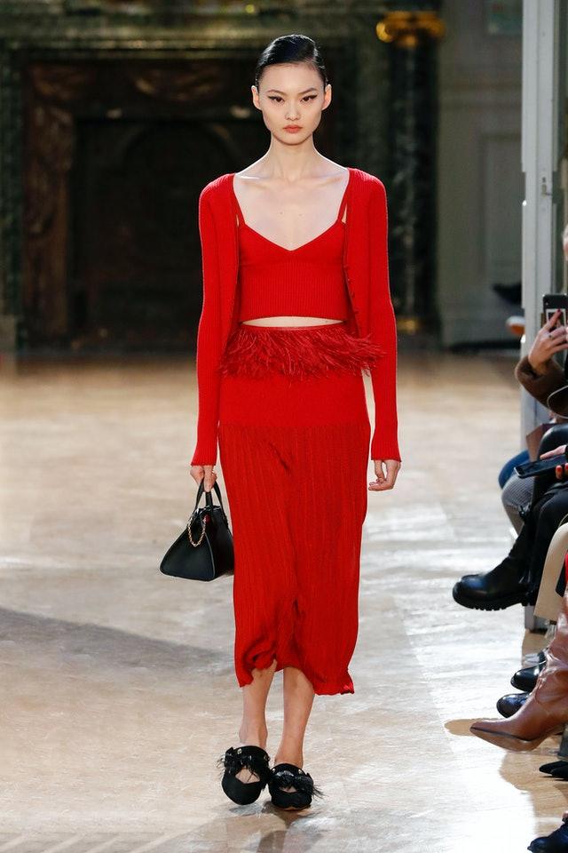 اختارات ماركة ألتوزارا Altuzarra تنسيق البلوفر الخفيف باللون الأحمر مع تنورة من نفس اللون وباليرين باللون الأسود مزوق بالريش لإطلالة ساحرة وعصرية.