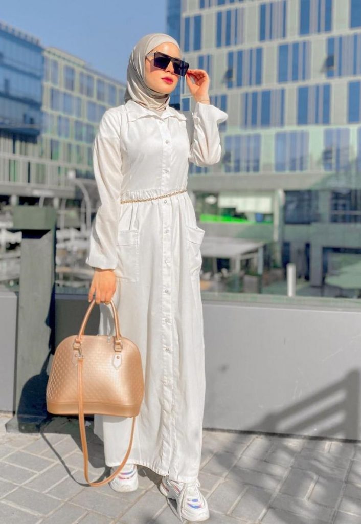قامت بتنسيقه مع حذاء مفتوح ذو كعب عالي وحجاب باللون الأبيض.