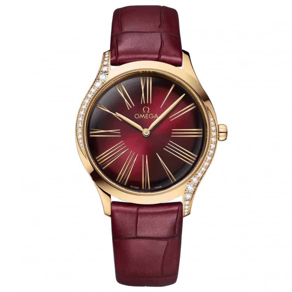 اخترنا لك من أوميغا ساعتها المصنوعة من الذهب الوردي الأنيق والمرصع بالألماس بالإضافة لسوار بالأحمر من الجلد في تصميم ناعم أنثوي وأنيق.