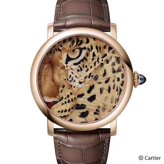 ومن علامة كارتييه الفرنسية نقدم لك ساعتها الفريدة المصنوعة من الذهب الوردي، بينما المينا تم تزيينها برسم وجه فهد من الخشب وقطعة من حجر الياقوت الأزرق في تصميم فني للغاية.