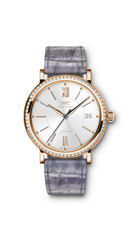 ومن ماركة أي دبليو سي السويسرية إليك هذه الساعة المصنوعة من الذهب الوردي المزين بالألماس مع سوار جلدي رمادي اللون في تصميم أنيق ورائع.
