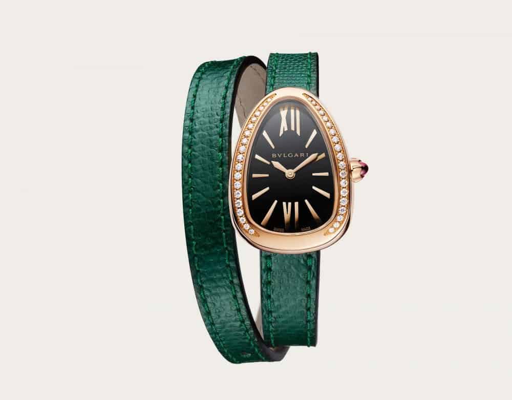 ومن العلامة الإيطالية بولغاري اخترنا لك ساعتها ذات تصميم سبرينتي الشهير والمصنوعة من الذهب الوردي عيار 18 قيراط المرصع بالألماس الذي يزين جوان المينا التي تشبه شكل رأس الأفعى مع سوار جلدي باللون الأخضر المميز في فصل الخريف.