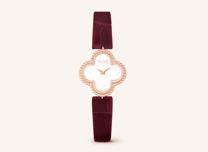 ومن الماركة الفرنسية فان كليف أند أربلز إليك هذه الساعة المصنوعة من الذهب الوردي المزين بالألماس وحجر اللؤلؤ مع سوار جلدي باللون الماروني، اللون الرائج في كل فصول الخريف.