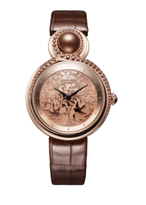 نستهل مجموعتنا بساعة العلامة السويسرية جاكيه درو المصنوعة من إطار من الذهب الوردي مع حجر لؤلؤ داكن بينما يوجد في المينا حجر محفور من الغرانيت البني، في تصميم زخرفي يناسب كل إطلالات الخريف خاصتك.