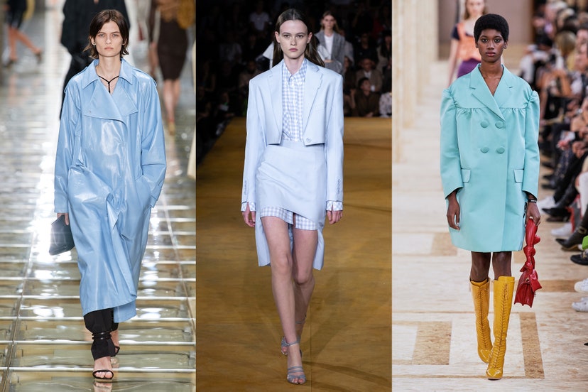 لون الصيف بامتياز، الأزرق السماوي، لذلك قامت الكثير من الماركات مثل Bottega Veneta, Burberry, Miu Miu، بتقديم تصاميم مميزة ومختلفة ويمكنك تنسيقه مع اللون الأسود، أو الأبيض، أو الأصفر.
